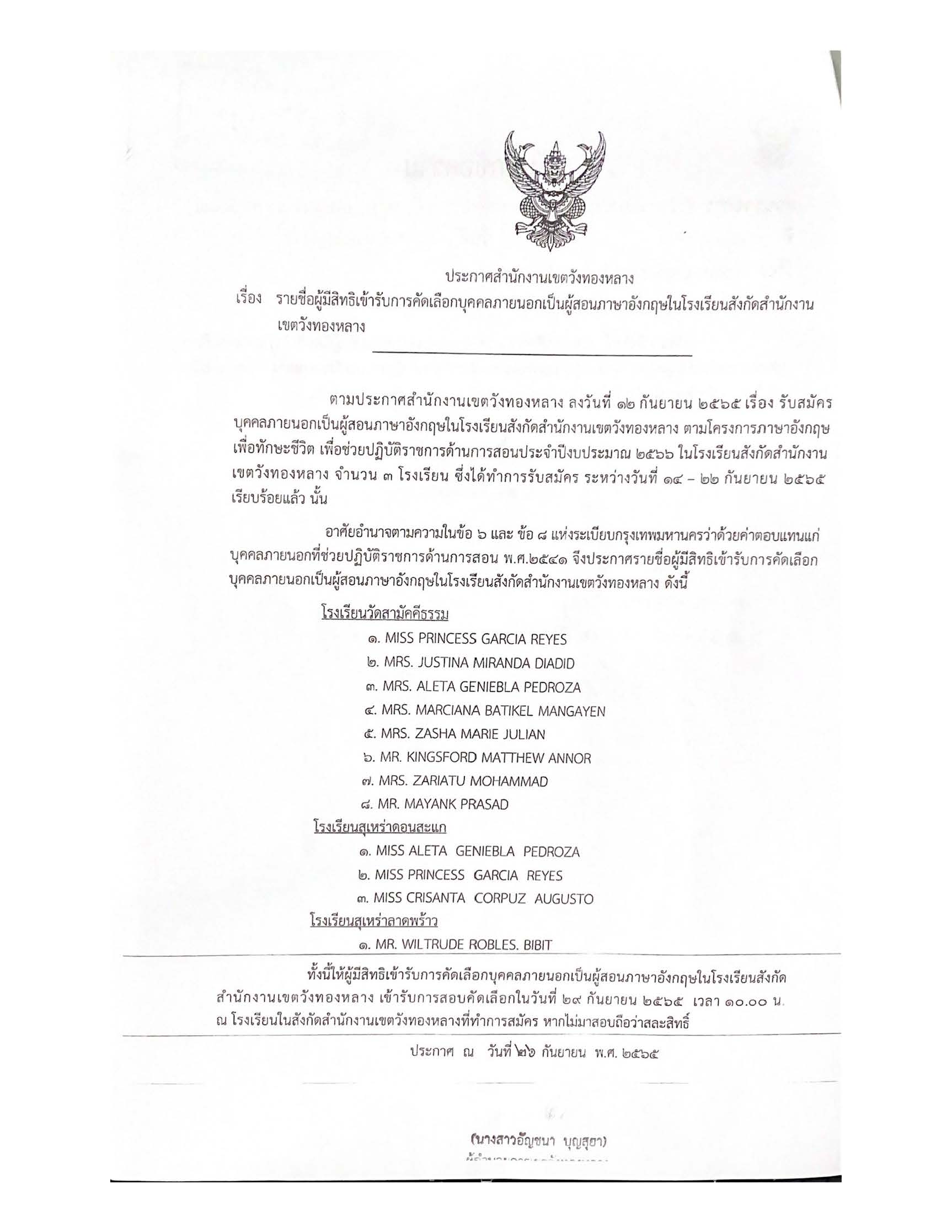 ประกาศรายชื่อผู้มีสิทธเข้ารับการคัดเลือกบุคคลภายนอกเป็นผู้สอนภาษาจีนและภาษาอังกฤษในโรงเรียนสังกัด สำนักงานเขตวังทองหลาง By Mayula Kongdee27 กันยายน 2022ไม่มีหมวดหมู่Leave a Comment on 27 ก.ย.65