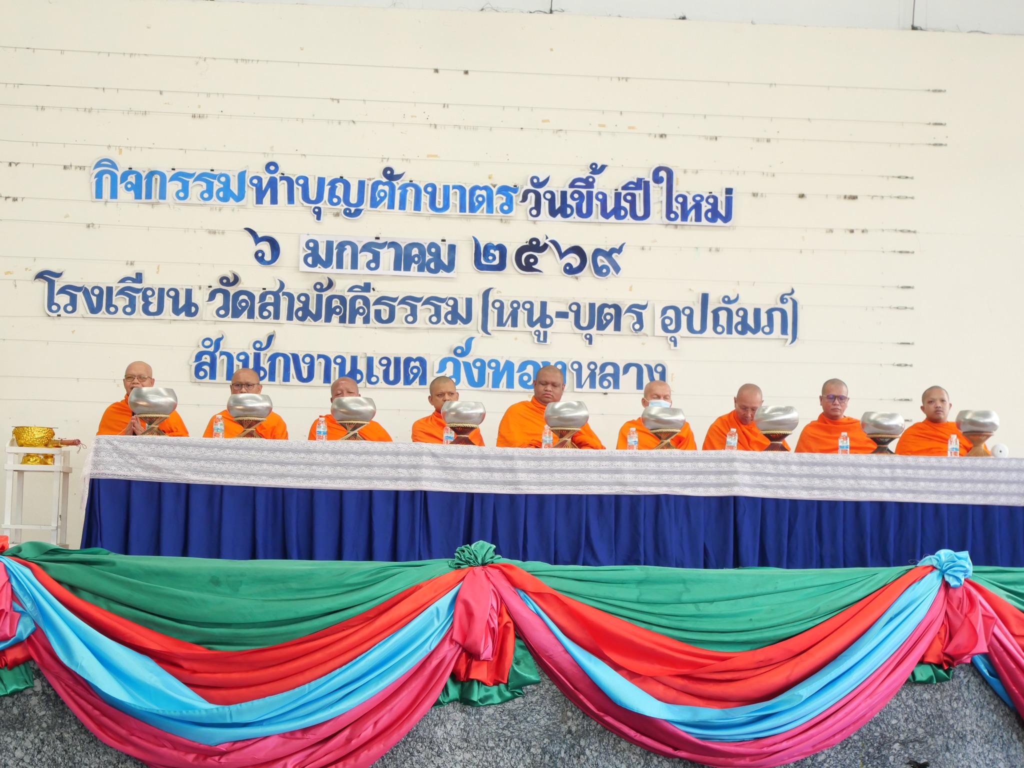 วันอังคารที่ 6 มกราคม พ.ศ. 2569 โรงเรียนวัดสามัคคีธรรม (หนู-บุตรอุปถัมภ์) ได้จัดกิจกรรมทำบุญตักบาตร เนื่องในโอกาสวันขึ้นปีใหม่ เพื่อความเป็นสิริมงคลแก่ผู้บริหาร คณะครู บุคลากรทางการศึกษา และนักเรียน อีกทั้งเป็นการส่งเสริมคุณธรรม จริยธรรม และการสืบสานวัฒนธรรมอันดีงามของไทย ในการนี้ นางสาวศิริรัตน์ นิยมการ ผู้อำนวยการสถานศึกษา เป็นประธานในกิจกรรม พร้อมด้วย นายอธิวัฒน์ เหล็กภูเขียว รองผู้อำนวยการสถานศึกษา และนางสาวเหลี่ยม มาใกล้ ตัวแทนคณะกรรมการเครือข่ายผู้ปกครองและชุมชน เข้าร่วมกิจกรรมอย่างพร้อมเพรียง กิจกรรมดังกล่าวได้รับความเมตตาจาก พระครูปริยัติวัชรธรรม (บุญเรือง กิตฺติปญฺโญ) เจ้าอาวาสวัดสามัคคีธรรม พร้อมพระสงฆ์รวมจำนวน 9 รูป มารับบิณฑบาต โดยบรรยากาศเป็นไปด้วยความเรียบร้อย อบอุ่น และเปี่ยมด้วยศรัทธา สะท้อนถึงความร่วมมืออันดีระหว่างโรงเรียน วัด และชุมชน โรงเรียนวัดสามัคคีธรรม (หนู-บุตรอุปถัมภ์) ขอขอบคุณทุกภาคส่วนที่ให้ความร่วมมือในการจัดกิจกรรมครั้งนี้ และขออำนวยพรให้ทุกท่านประสบแต่ความสุข ความเจริญ มีสุขภาพแข็งแรงตลอดปีใหม่ 2569 By Mayula Kongdee6 มกราคม 2026ไม่มีหมวดหมู่Leave a Comment on 6 ม.ค.69